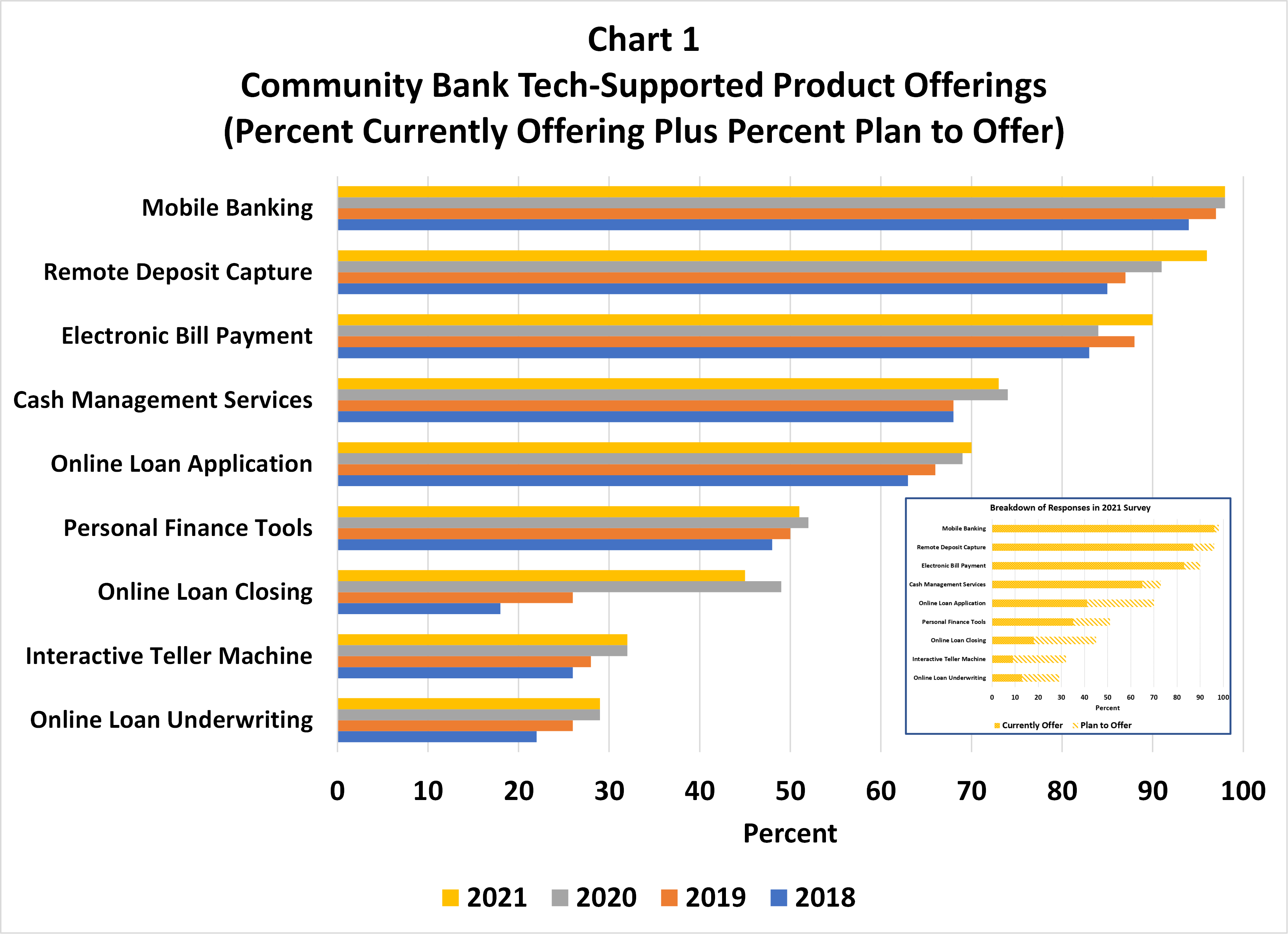 As shown in Chart 1, at 98%, mobile banking is the most frequently offered service in 2021, up from 94% in 2018. The next most frequently offered 2021 community bank products are remote deposit capture (96%), electronic bill payment (90%) and cash management services (73%), all showing increases since 2018. The less frequently offered 2021 community banking products in order of importance are online loan applications (70%), PFM tools (51%), online loan closing (45%), ITMs (32%) and automated loan underwriting (29%). The biggest uptake since 2018 has been online loan closing enabled by e-signature capabilities, increasing from 18% to 45%. Plans to offer online loan applications remains high, at 70%.