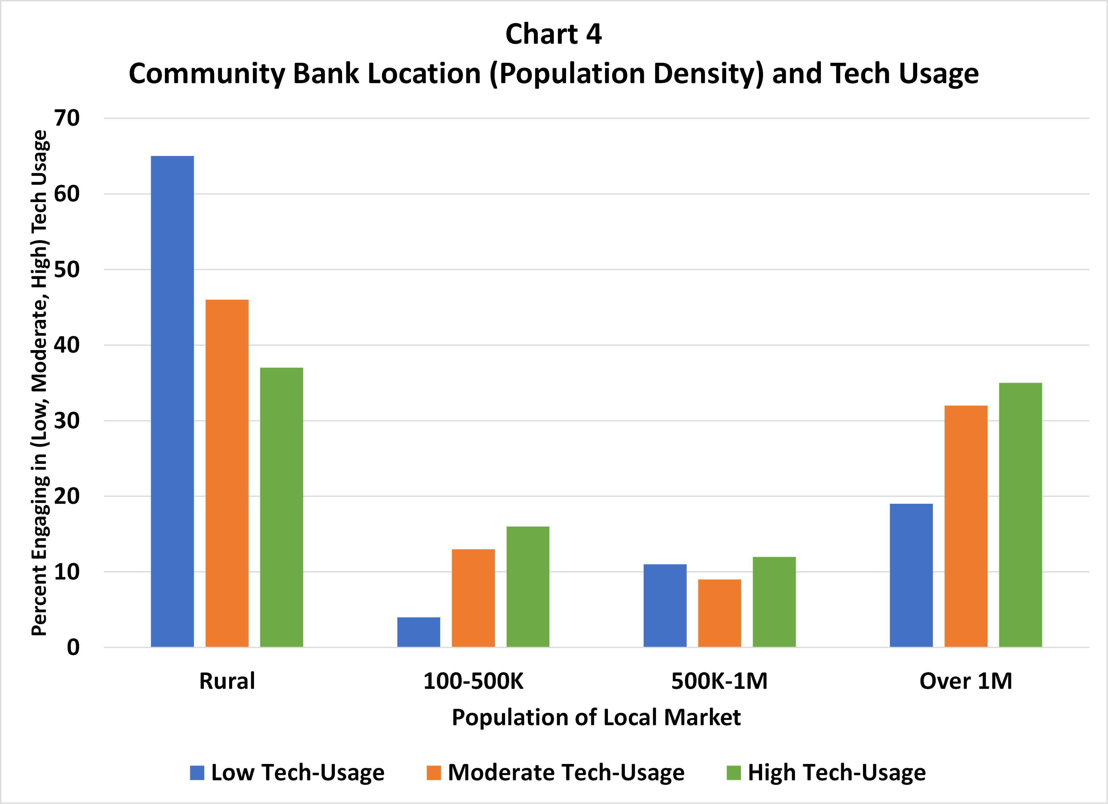 Location also matters. Chart 4 shows that community banks in Combined Statistical Areas with populations greater than one million are more likely to report moderate to high tech-usage, while those in rural areas are more likely to report low tech-usage (65% versus 47% overall). Location by population density is a good proxy for broadband availability and likely facilitates greater demand for digital banking products.