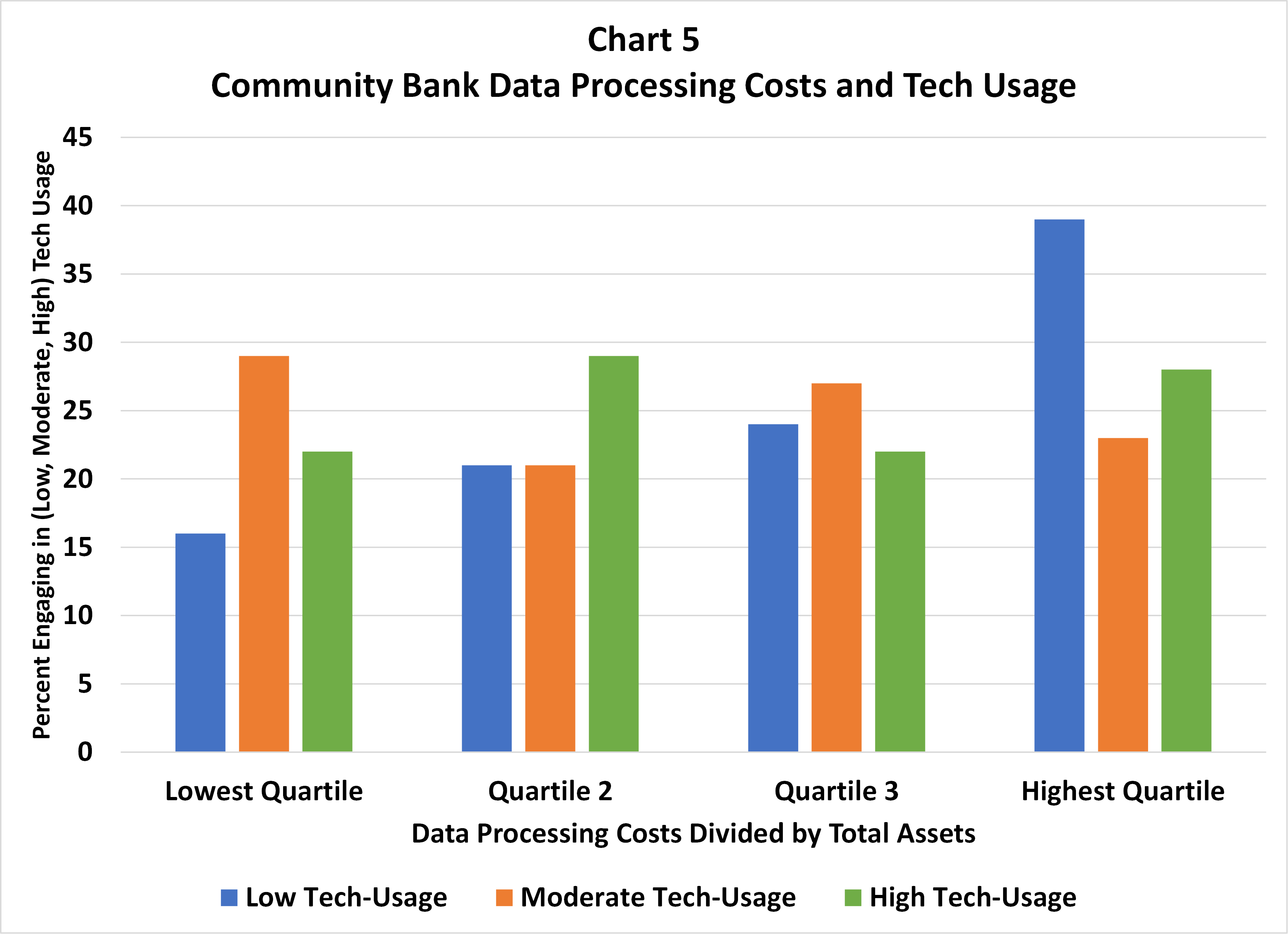 Increased technology investment should result in greater economies of scale. One proxy for scale is data processing costs divided by total assets, where a low ratio indicates greater economies of scale than a higher ratio. This ratio is a reasonable proxy for economies of scale because tech investment should ultimately result in an increased book of business. Its weakness, however, is that it ignores the impact of tech investment in products and services that generate non-interest income as well as the other costs, especially compensation, needed to support tech investment. Nonetheless, we compared tech usage to this ratio and found that just 16% of low tech-usage firms were in the lowest quartile of data processing costs divided by total assets, while 39% of these same firms were in the highest quartile (see Chart 5).