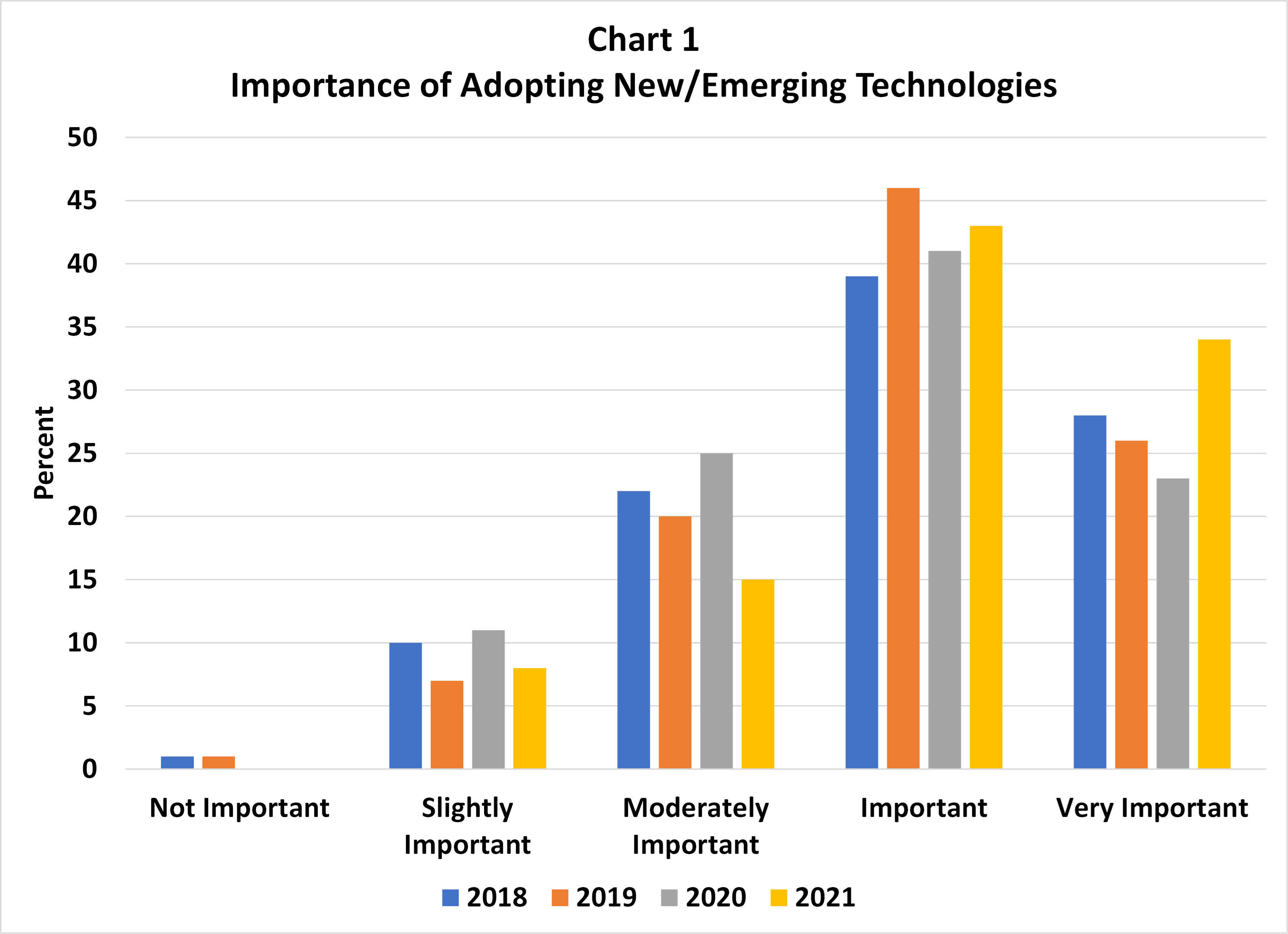 In 2021, more than 77% of respondents to the Survey reported that it was “very important” or “important” to adopt new or emerging technologies, a full 10 percentage point increase from the first time the question was asked in 2018 (see Chart 1). High tech-usage firms, at 46%, more frequently reported that it was “very important” to adopt new or emerging technologies versus 19% for low tech-usage firms. Likewise, larger banks (those in the highest asset quartile) more frequently reported (50%) that it was “very important” to adopt new or emerging technologies versus 26% for the smallest banks. However, no association was found between bank views on new/emerging technology adoption and market size, location, or profitability.