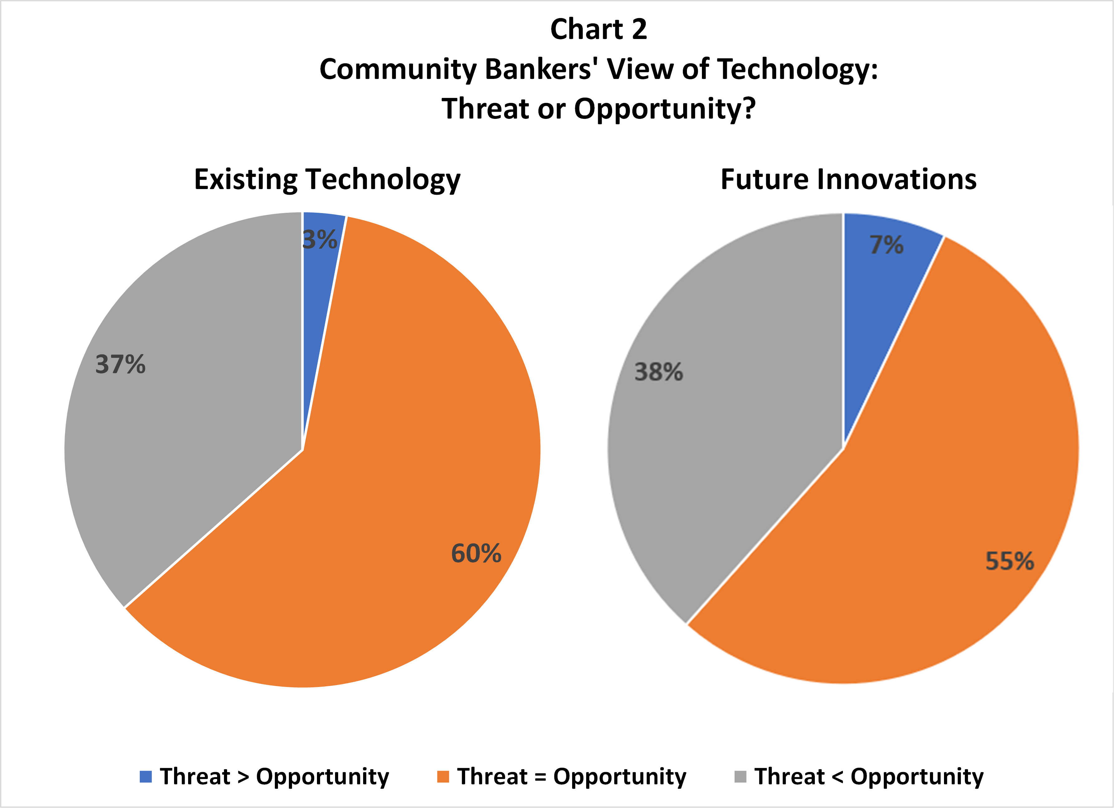 In the 2021 Survey, community banks were asked for the first time about their views of existing technology and future banking innovation through the lens of an opportunity and threat assessment. As shown in Chart 2, not much difference is found between those reporting “more an opportunity than a threat” between existing technology (37%) and future banking innovation (39%).