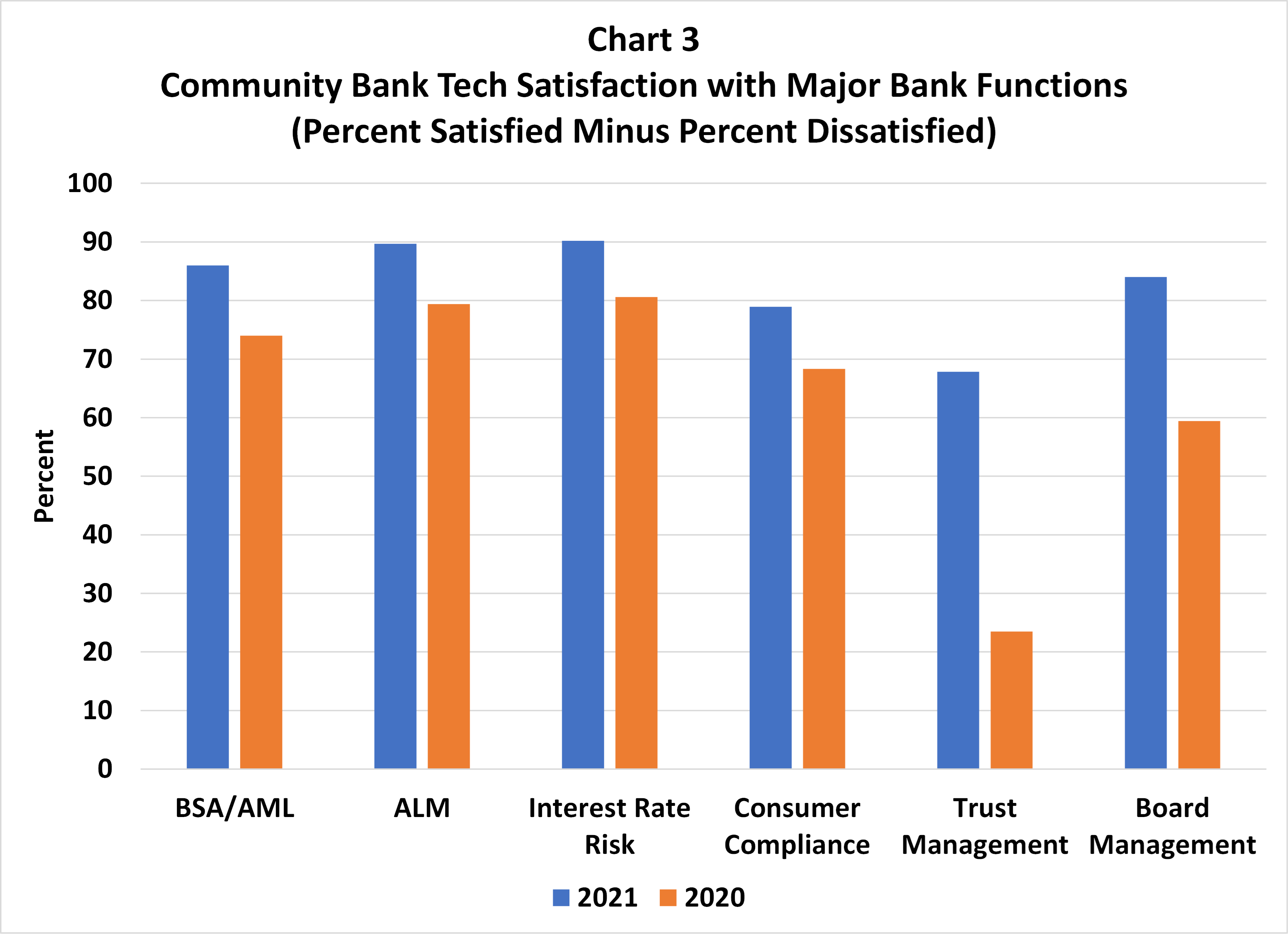 While only about one-third of the respondents view existing technology as more of an opportunity than a threat, banks are generally very satisfied with tech’s impact on major bank functions. We create the metric net satisfied banks by subtracting the percentage of responses that were “dissatisfied” and “highly dissatisfied” from the percentage of responses that were “highly satisfied” and “satisfied.” For each bank function ― Bank Secrecy Act/Anti-Money Laundering (BSA/AML) compliance, asset liability management (ALM), interest rate risk, consumer compliance, trust management and board management ― Chart 3 shows that satisfaction in 2021 improved across all functions compared to 2020.