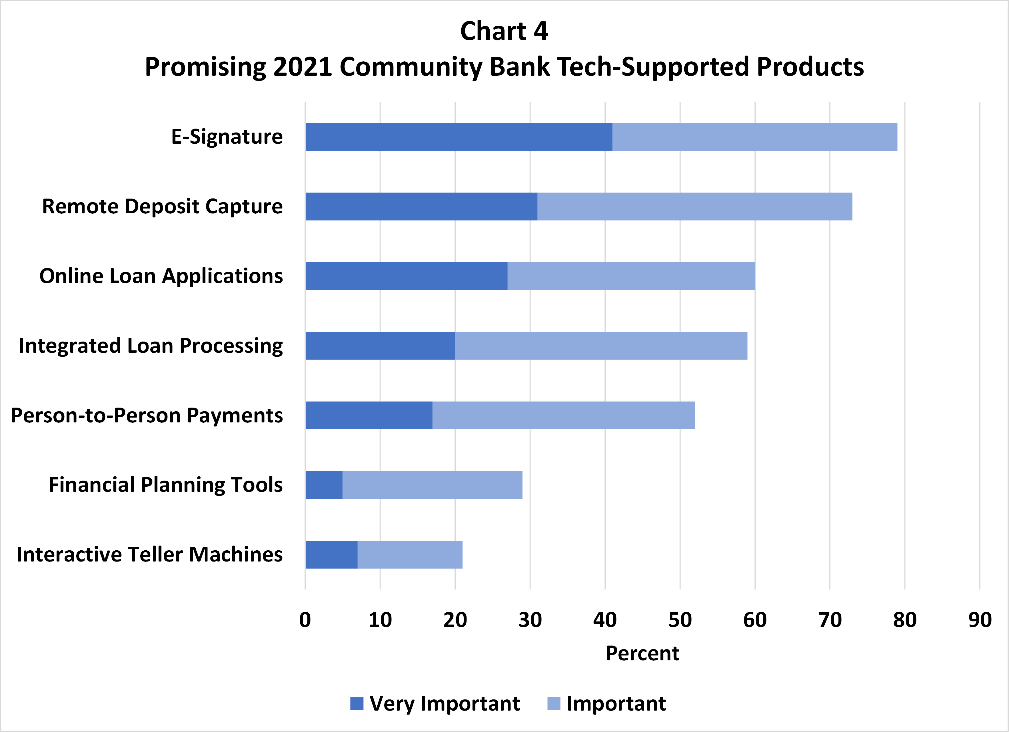 Banks were also asked about the importance of promising tech-supported product opportunities, including e-signature, remote deposit capture, online loan applications, integrated loan processing, person-to-person (P2P) payments, financial planning tools and ITMs. As shown in Chart 4, e-signature is viewed most positively with 41% reporting “very important,” followed by remote deposit capture (31%) and online loan applications (27%). Based on overall importance (combining “very important” and “important” responses), e-signature remains the most promising product (79%), followed by remote deposit capture (73%) and online loan applications (60%).