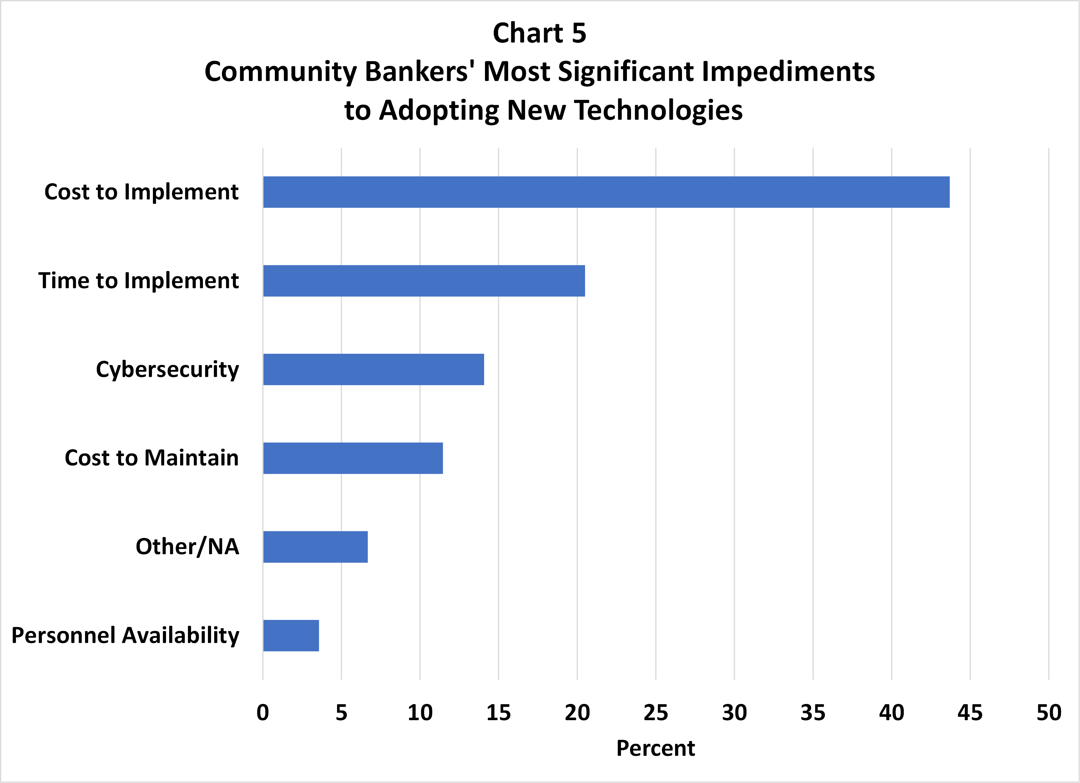 What are the most significant impediments to community banks adopting these products? Chart 5 shows that cost is the number one reason, followed by time to implement – which is also another cost. Interestingly, high tech-usage banks are less likely to report cost to implement (39% versus 44% overall) and cost to maintain (8% versus 11% overall) as the most significant impediment, whereas the opposite is true for low tech-usage banks. However, high tech-usage banks are more likely to report time to implement (26% versus 21% overall) as their most significant impediment.