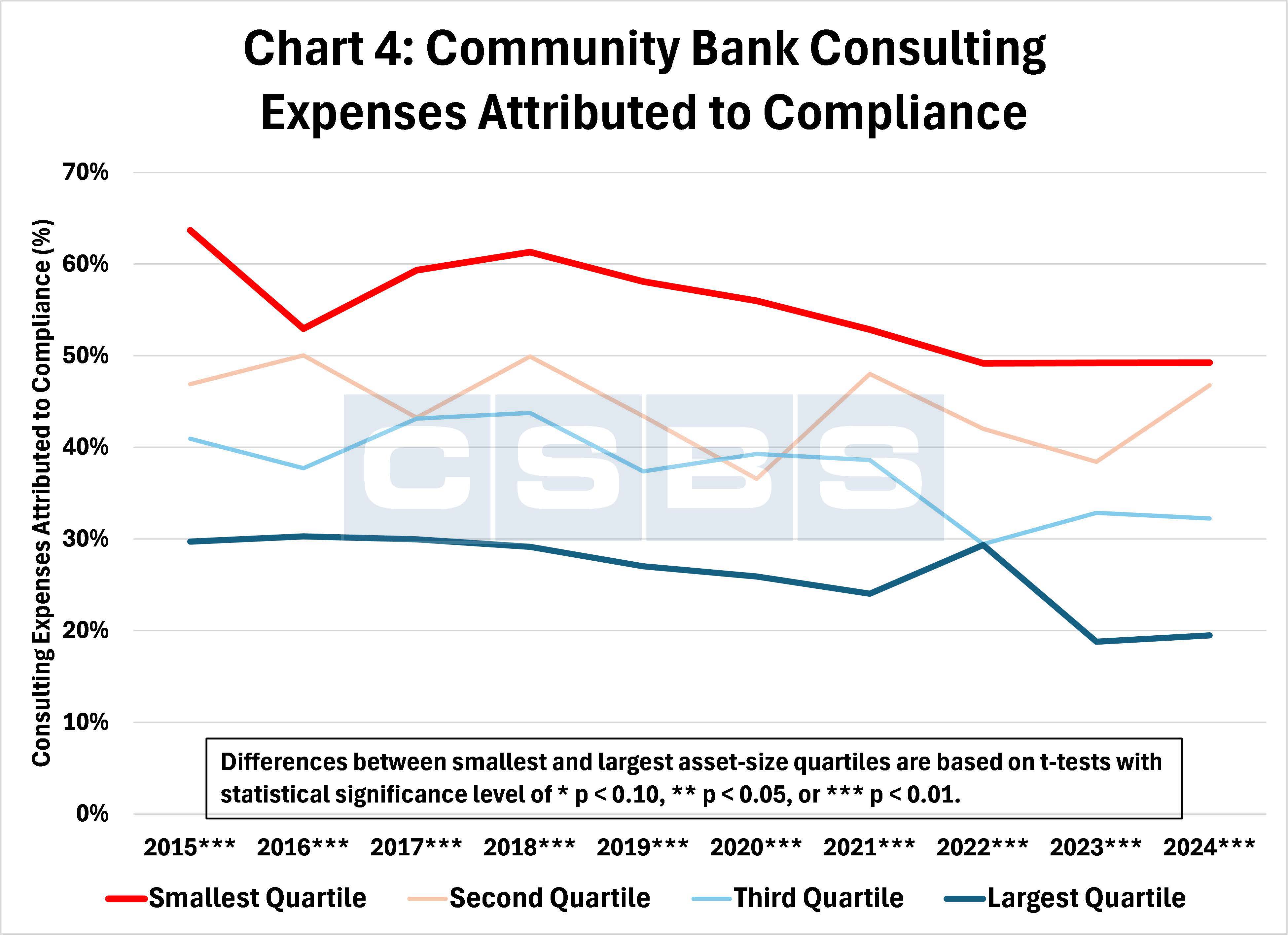 In each annual survey, hundreds of community bankers estimate how much of their operating costs go toward compliance—broken down into categories such as personnel, data processing, legal, accounting and auditing, and consulting. Responses to the banks’ financial statements were then matched to the surveyed banks and then grouped into asset-size quartiles to see how the burden scales. The research question being asked is deceptively simple: are smaller banks devoting a greater share of their resources to compliance than their larger peers? And if so, how large—and how consistent—is that gap?